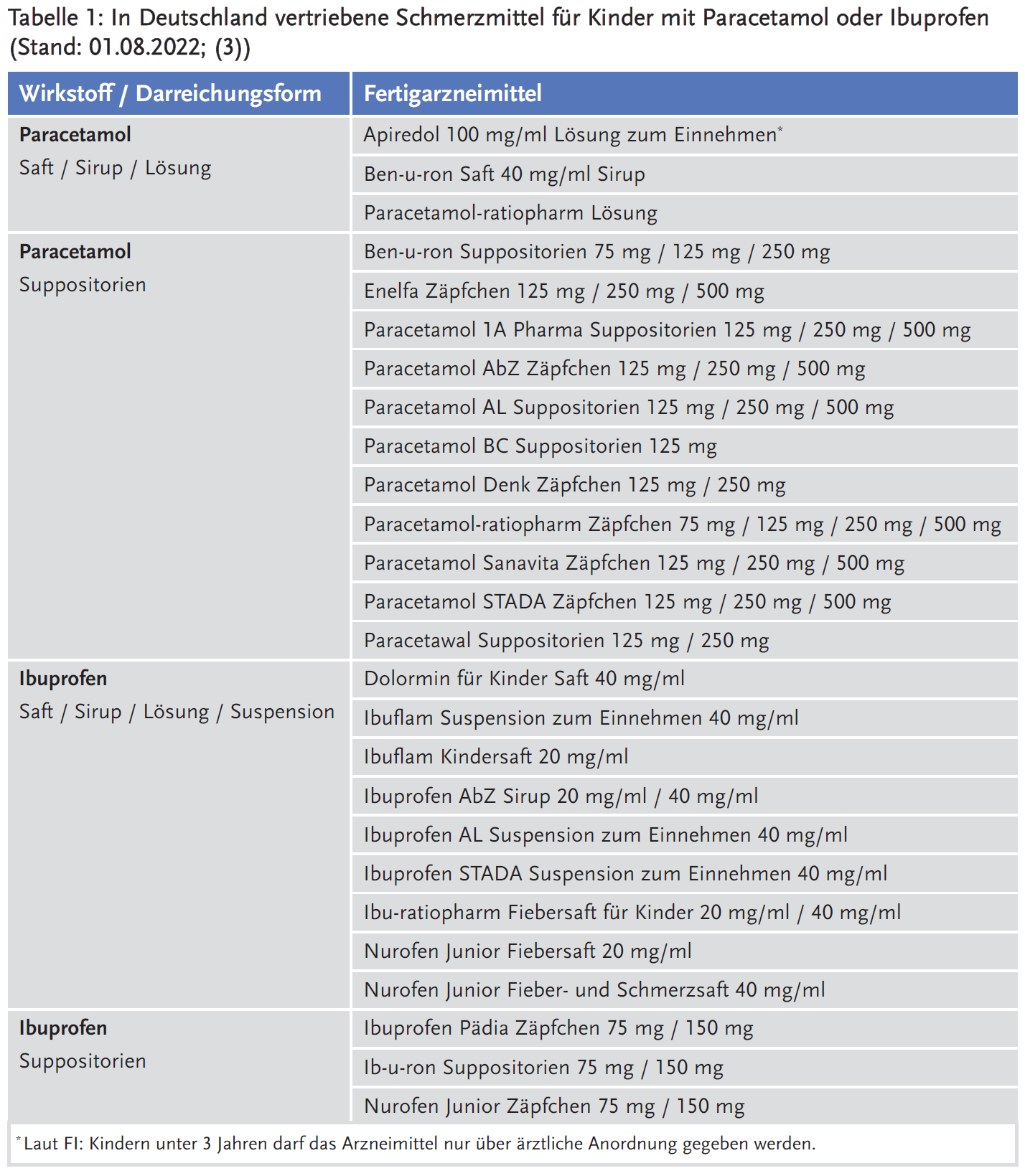 Paracetamol-Säfte werden derzeit nur noch von drei pharmazeutischen Unternehmern angeboten (siehe Tabelle 1); alle anderen Marktteilnehmer wie Paracetamol Saft Hexal® oder Paracetamol STADA Saft® sind seit längerer Zeit außer Vertrieb. Im Gegensatz dazu wird Ibuprofen-Saft zumindest von noch sieben pharmazeutischen Unternehmern vertrieben z. B. Nurofen Junior Fieber- und Schmerzsaft®, Dolormin für Kinder®, Ibuprofen AbZ Sirup®. Nicht viel besser ist die Marktlage bei den Zäpfchen: Paracetamol-Suppositorien für Kinder werden zwar von acht pharmazeutischen Unternehmern in unterschiedlichen Stärken (75–250 mg pro Zäpfchen) angeboten, Ibuprofen-Suppositorien aber nur von drei (75 bzw. 125 mg pro Zäpfchen) (siehe Tabelle 1) (3).