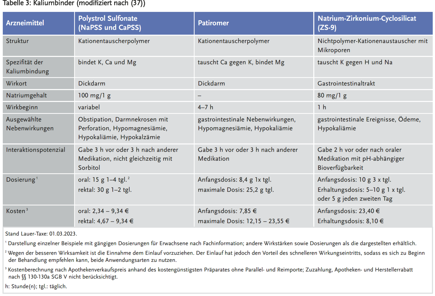 - In Tabelle 3 sind die Eigenschaften der drei Kaliumbinder dargestellt. Die Ergebnisse der relevanten klinischen Studien zur Wirksamkeit dieser Arzneimittel sind in Tabelle 4 zusammengefasst.