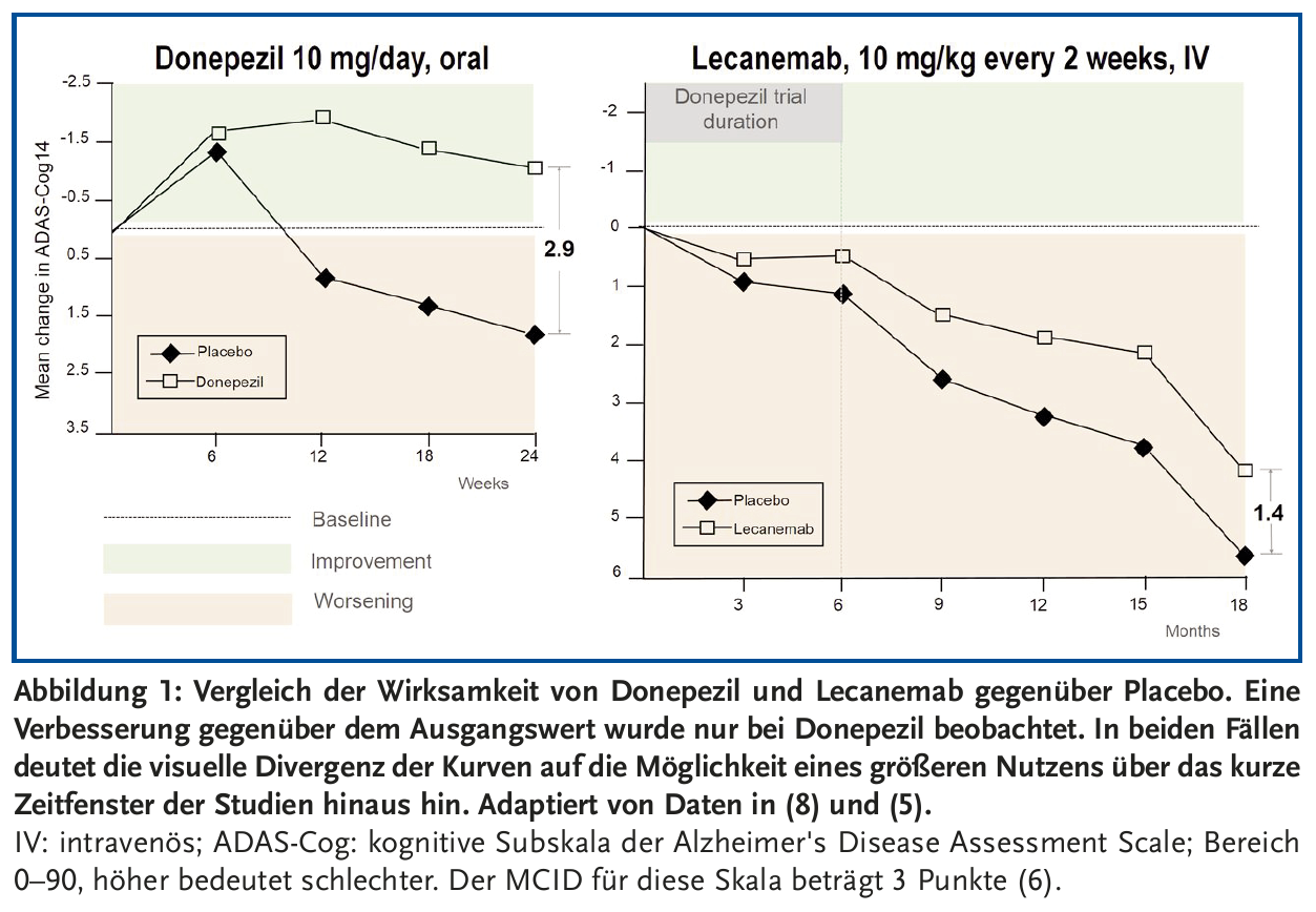 Nach einem Cochrane Review sind selbst die Verbesserungen in den neurologischen Scores durch Donepezil nicht von einem relevanten Benefit bezüglich des klinischen Outcome und der Lebensqualität begleitet (9), was eine klinische Relevanz des Effektes von Lecanemab auf die neurologischen Scores fast schon ausschließen lässt.