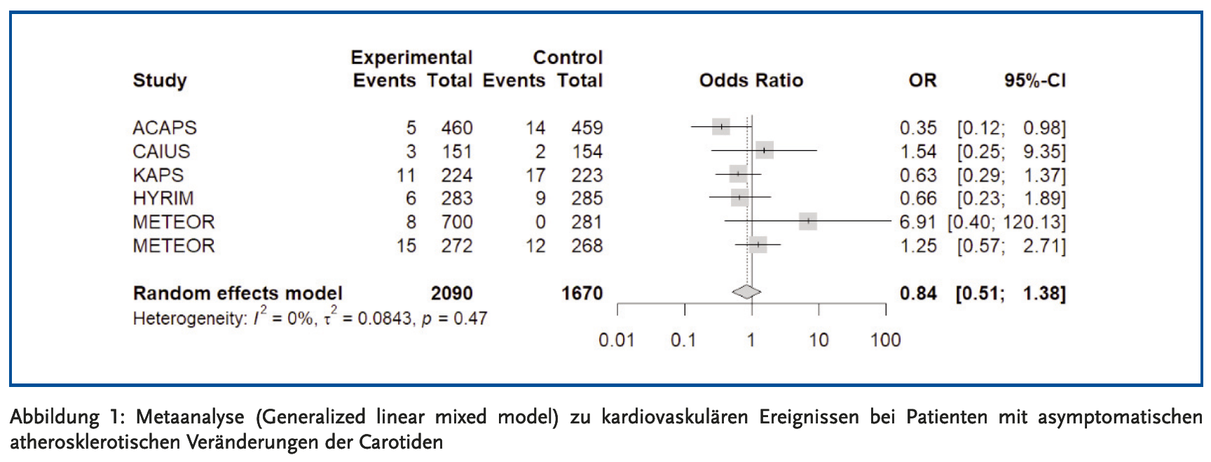 Insgesamt traten in den sechs RCT im Statin-Arm 48 und im Placebo-Arm 54 kardiovaskuläre Ereignisse auf, entsprechend einer Ereignisrate von 2,3 % vs. 3,2 %. Die Metaanalyse (Abbildung 1) zeigt eine Odds Ratio von 0,84. Aufgrund der geringen Ereigniszahl entsprechen sich OR und relatives Risiko (RR) weitgehend. Statine führten somit im Vergleich zu Placebo zu einer relativen Risikoreduktion (RRR) für kardiovaskuläre Ereignisse von etwa 16 %. Dieser Effekt ist geringer als in anderen primärpräventiven Studien: Ein umfassender Review der USPSTF (United States Preventive Services Taskforce) (15) von 2022 ergab eine RRR von 28 % durch Statine bei Patienten ohne manifeste kardiovaskuläre Erkrankung (22 RCTs, n = 90624). Die Analysen der CTT(Cholesterol Treatment Trialists)-Collaboration haben eine weitgehend konstante RRR durch Statine über verschiedene Patientenpopulationen der Primär- und Sekundärprävention hinweg gezeigt (16). Die niedrigere RRR in den vorliegenden Studien erscheint deshalb am ehesten zufallsbedingt: Die 95 %-Konfidenzintervalle deuten auf starke statistische Unsicherheit hin und schließen auch die 1 (d. h. kein statistisch signifikanter Unterschied zwischen den Gruppen) mit ein.