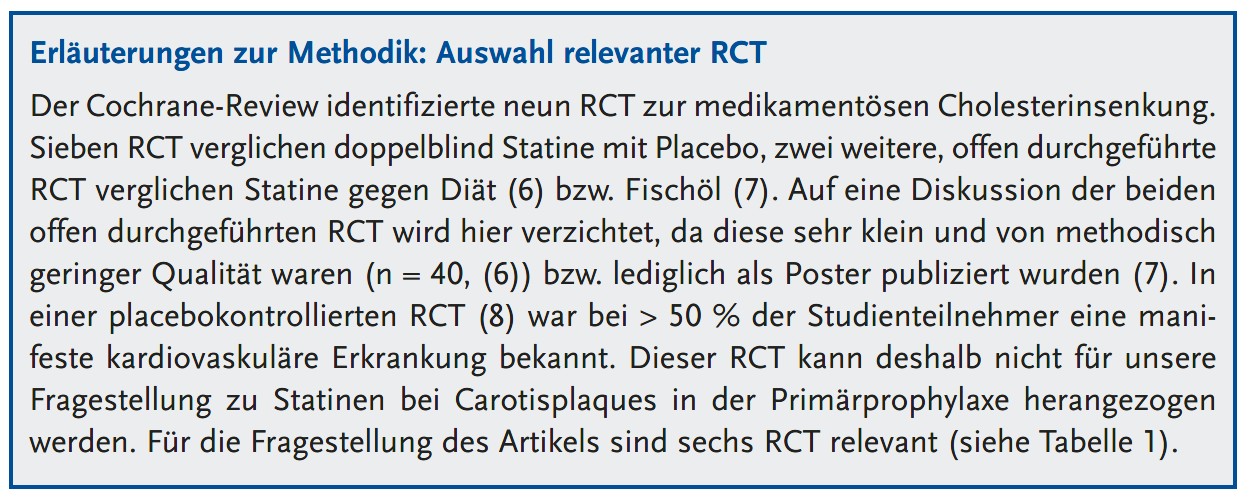 Im Jahr 2023 erschien ein systematischer Review der Cochrane Collaboration mit dem Titel „Pharmakologische Interventionen bei asymptomatischer Karotisstenose“ (5). Abweichend von dem Titel des Reviews wurde eine weit gefasste Suchstrategie verfolgt, die nicht nur RCT zu Patienten mit Carotisstenose einschloss, sondern auch RCT zu Patienten mit jeglichen atherosklerotischen Veränderungen der Carotiden. Es kann deshalb davon ausgegangen werden, dass der Cochrane-Review alle RCT erfasst hat, die Statine bei Patienten mit Carotisplaques untersuchten.