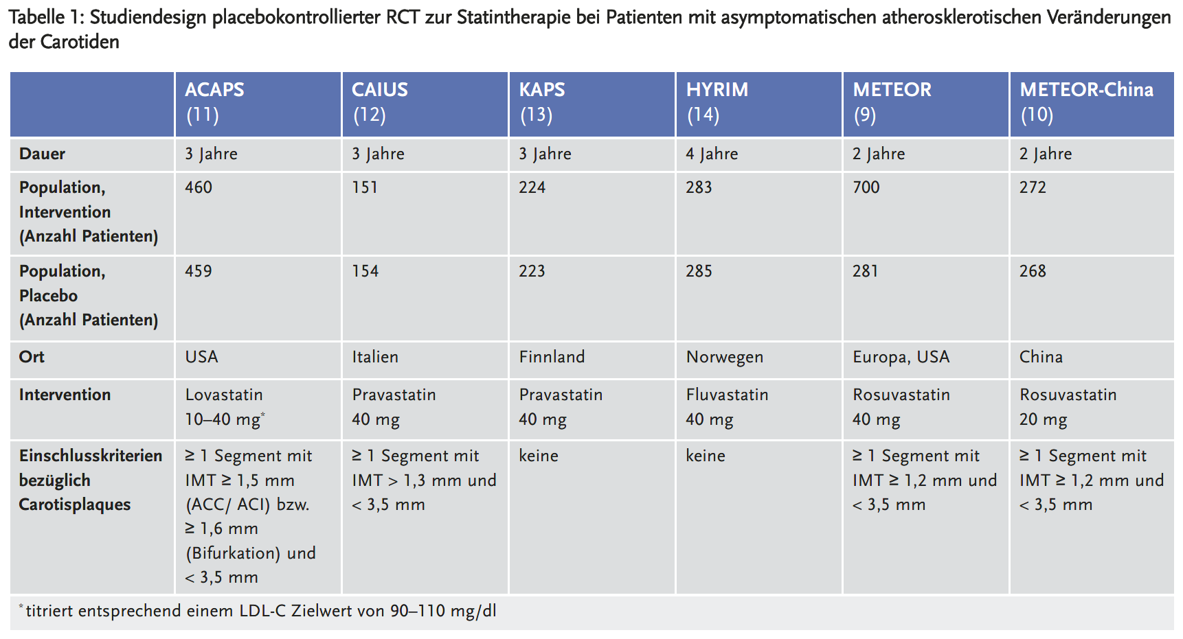 Das Durchschnittsalter der untersuchten Patienten lag bei knapp 60 Jahren. Die Studien KAPS (13) und HYRIM (14) schlossen ausschließlich männliche Patienten ein, in den übrigen RCT war das Geschlechterverhältnis weitgehend ausgewogen. Der durchschnittliche LDL-C-Wert war zu Studienbeginn mit 137 mg/dl am niedrigsten in der Studie METEOR-China (10), in drei RCT lag er zwischen 150 und 160 mg/dl (9, 11, 14) und in zwei RCT zwischen 180 und 190 mg/dl (12, 13). Nur die Studie ACAPS (11) forderte als Einschlusskriterium das Vorhandensein von Carotisplaques entsprechend der heute gängigen Definition, nämlich mindestens eine IMT-Messung ≥ 1,5 mm. Aufgrund der Baseline-Charakteristika ist anzunehmen, dass die Studie CAIUS (12) überwiegend Patienten mit Carotisplaques einschloss (maximale IMT-Messung zu Studienbeginn im Durchschnitt 1,9 mm). Die übrigen Studien geben nur den Durchschnitt aller IMT-Messungen an. Dieser lag zwischen 1,1 mm in der Studie METEOR-China (10) und 1,7 mm in der Studie KAPS (13). Die Werte sind nicht direkt miteinander vergleichbar, da sich die IMT-Messungen in den verschiedenen Studien unterscheiden, beispielsweise hinsichtlich der Anzahl der Messungen und ihrer genauen Lokalisation. In den Studien KAPS (13) und HYRIM (14) wurden wahrscheinlich überwiegend Patienten mit Carotisplaques untersucht (IMT-Durchschnittswerte von 1,7 mm bzw. 1,6 mm), in den Studien METEOR (9) und METEOR-China (10) war ihr Anteil vermutlich geringer (IMT-Durchschnittswerte von 1,2 mm bzw. 1,1 mm).