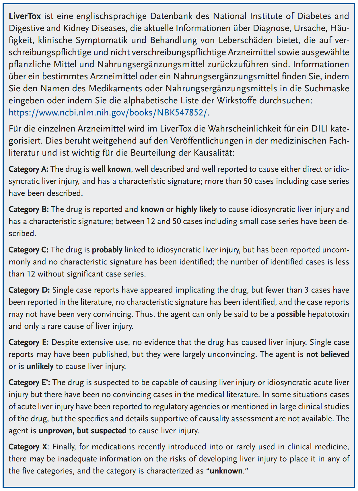 Viele Arzneimittel werden über die Leber verstoffwechselt und können Leberschädigungen verursachen, die entweder hepatozellulär, cholestatisch oder als eine Mischform eingeordnet werden. Eine akute Leberschädigung durch Medikamente (DILI, drug induced liver injury) wird entweder direkt (dosisabhängig und vorhersehbar, zum Beispiel durch Paracetamol) oder seltener idiosynkratisch (dosisunabhängig und unvorhersehbar) ausgelöst. Möglich ist auch die indirekte immunvermittelte akute Leberschädigung, die mit einer gewissen Latenz auftritt (z. B. durch Checkpoint-Inhibitoren) (2).