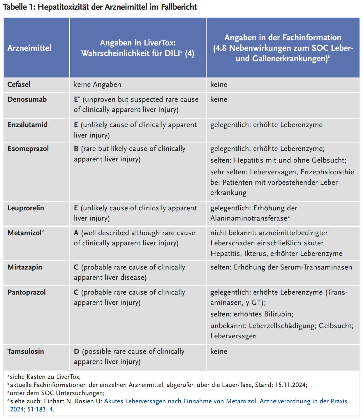 Aufgrund der parallelen Gabe einiger Arzneimittel, die zum Teil auch hepatotoxisch sein können, ist für diesen Fall nicht sicher, ob Enzalutamid als verantwortlich für den DILI auszumachen ist. Der Effekt des Absetzens von Enzalutamid und der Reexposition (positive Rechallenge) könnte möglicherweise durch die Gabe von Prednisolon beeinflusst worden sein. Es ist denkbar, dass die Kombination von Arzneimitteln (z. B. Metamizol + Enzalutamid oder Mirtazepin + Enzalutamid) die Toxizität hervorgerufen hat, z. B. durch die vermehrte Bildung von toxischen Metaboliten (Enzalutamid, aber auch Metamizol, sind starke CYP3A4-Induktoren) (Tabelle 1). Die Melder gehen von einer Assoziation mit Enzalutamid aus, da im relevanten Zeitraum keine weiteren Medikationsänderungen vorgenommen worden waren.