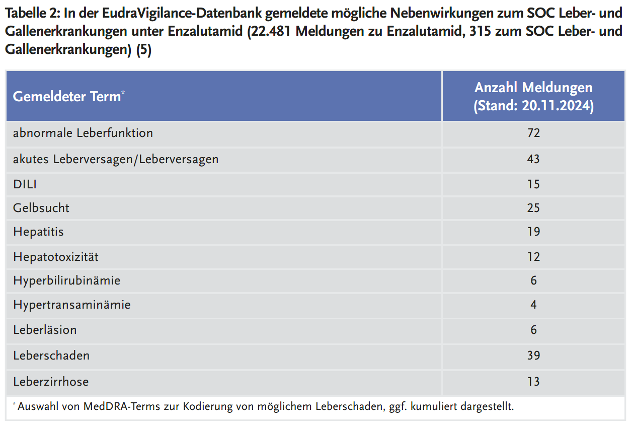 Dies zeigt deutlich, wie schwierig eine Kausalitätsbewertung bei Verdachtsfällen von Nebenwirkungen sein kann, insbesondere wenn mehrere Arzneimittel gleichzeitig eingenommen werden bzw. wenn mehrere konkurrierende Ursachen vorliegen. Im vorliegenden Fall besteht eine mögliche Kausalität aufgrund des zeitlichen Zusammenhangs und der positiven Rechallenge. Dafür sprechen auch weitere Meldungen zu Enzalutamid in der EudraVigilance-Datenbank gemeldeter Verdachtsfälle von Arzneimittelnebenwirkungen (Tabelle 2). Dagegen, dass andere der eingenommenen Arzneimittel, die zum Teil bekannterweise hepatotoxisch sind, eine Rolle gespielt haben, spricht deren lange Einnahmezeit, in der kein DILI auftrat. Ob Enzalutamid allein ursächlich war – oder in einem Zusammenwirken mehrerer potenziell hepatotoxischer Arzneimittel – lässt sich nicht festlegen.