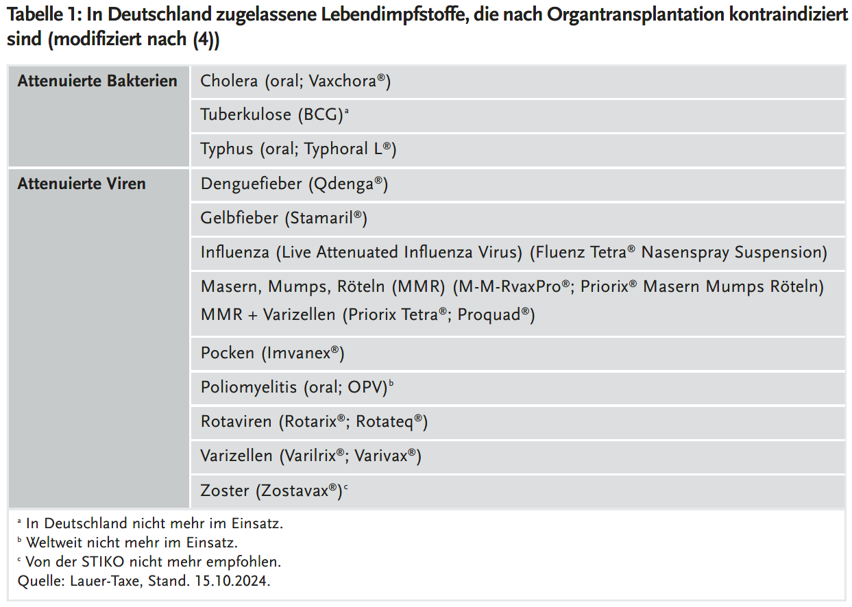 Patientinnen und Patienten bleiben nach Organtransplantationen zeitlebens immunsupprimiert, sodass grundsätzlich eine lebenslange Kontraindikation für Lebendimpfungen besteht. Nach individueller Risiko-Nutzen-Entscheidung können Patientinnen und Patienten, bei denen vor Organtransplantation keine vollständige Immunisierung gegen Masern, Mumps oder Röteln geimpft werden.
