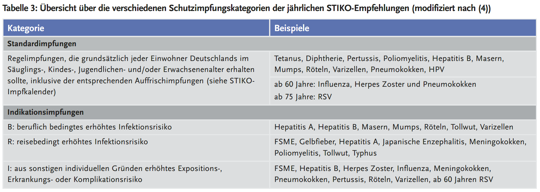 Reiseimpfungen werden hier nicht ausführlich besprochen. In Tabelle 3 findet sich eine Übersicht über die verschiedenen Schutzimpfungskategorien der jährlichen STIKO-Empfehlungen wieder.